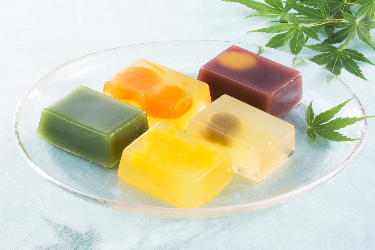 「紅葉だより」は、ひんやりとなめらかな水羊羹と和風ゼリーの詰合せです。