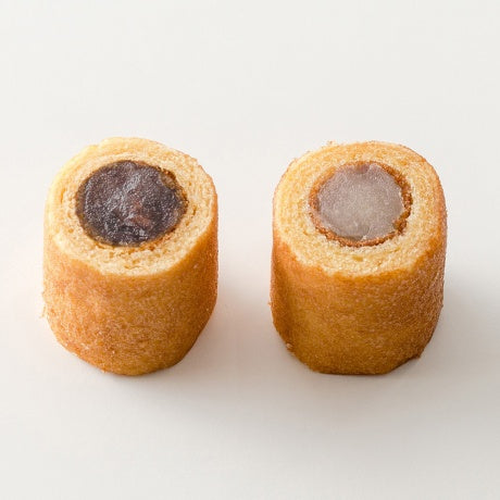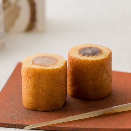 カステラの切り口を十二単衣に見立て、赤あんを平氏、白あんを源氏として、一つの小箱に納めて平和を象徴しています。