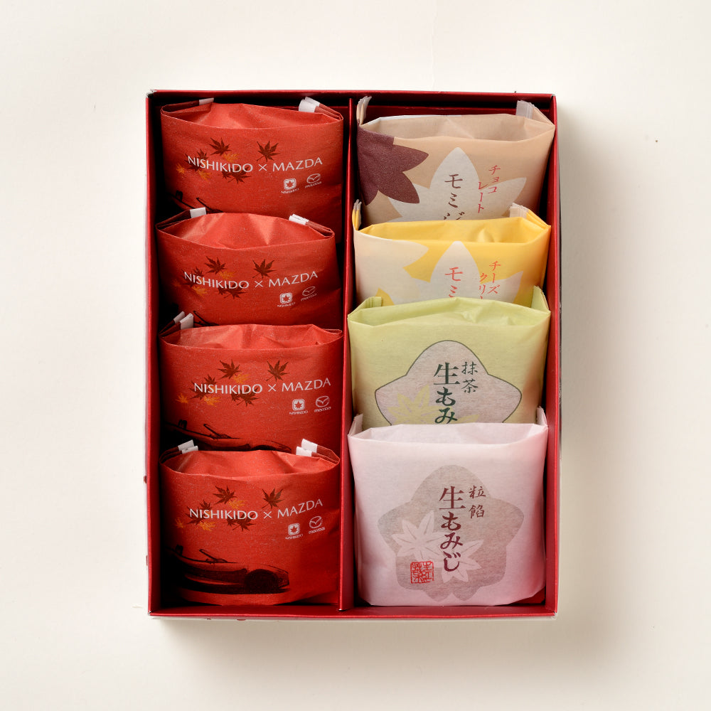 内容量 | にしき堂×MAZDA特製饅頭×4、生もみじ(粒あん)×1、生もみじ(抹茶あん)×1、チーズクリームモミジ×1、チョコレートモミジ×1 |